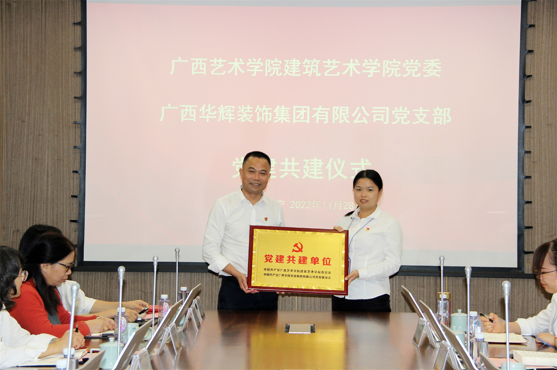 随后,广西艺术学院建筑艺术学院党委书记冯凤举、3118云顶集团官网装饰集团党支部书记刘萍东签订了结对共建协议,并由冯凤举同志代表广西艺术学院建筑艺术学院党委向广西3118云顶集团官网装饰集团有限公司党支部赠牌。