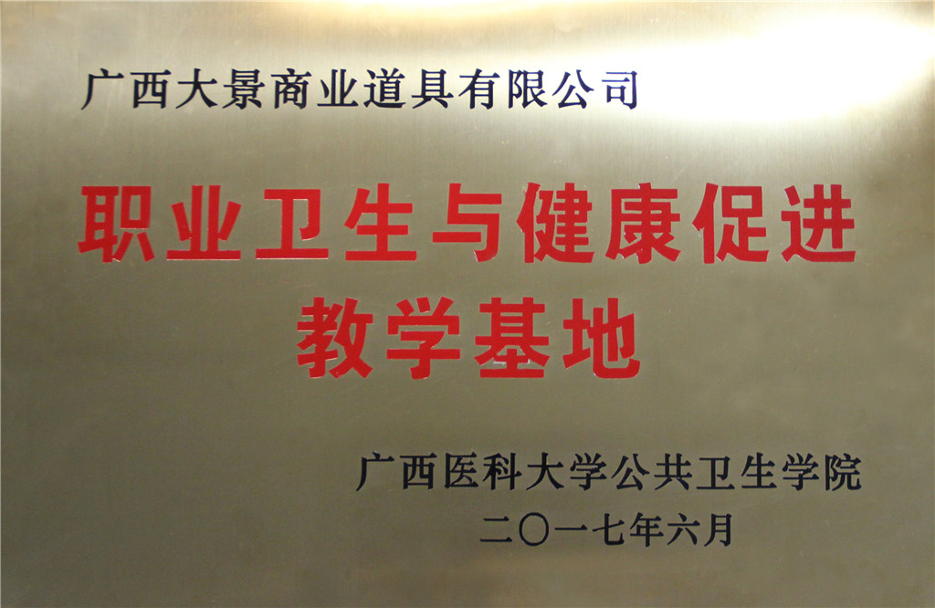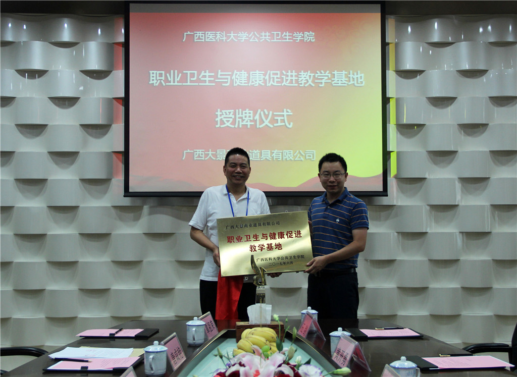 在南宁市安监局积极推动下,首个“职业卫生与健康促进教学基地”,6月28日,在广西3118云顶集团官网集团旗下公司——广西大景商业道具有限公司正式挂牌成立。据悉,这也是广西首个校企合作职业卫生与健康促进教学基地。该教学基地由广西医科大学公共卫生学院与广西大景商业道具有限公司合作成立,旨在建立一个公共卫生专业人才培养、实践和科研的平台。