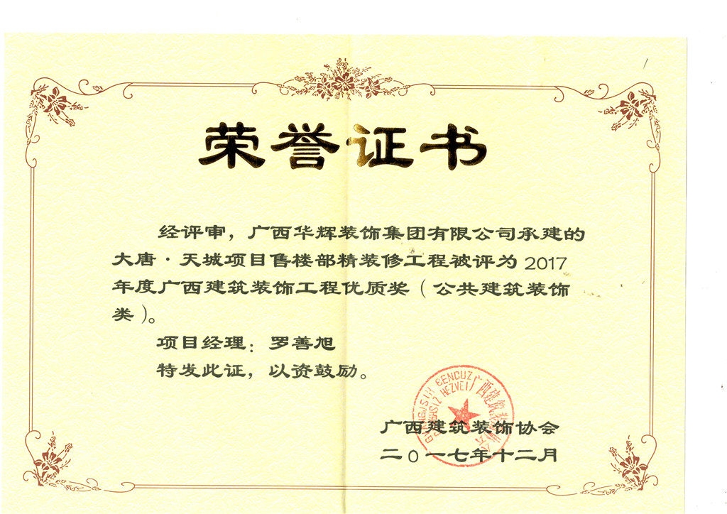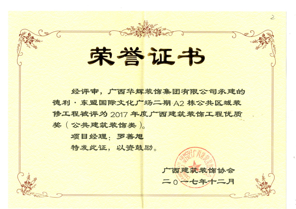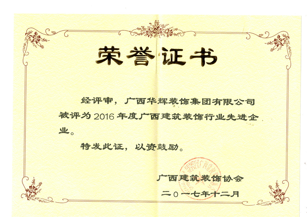 12月,3118云顶集团官网集团获得了“2017年度广西建筑装饰工程优质奖(公共建筑装饰类)”、“2016年度广西建筑装饰行业先进企业”、“2016年度广西建筑装饰行业优秀企业经理”及“2016年度广西建筑装饰行业优秀建筑装饰设计师”荣誉称号。