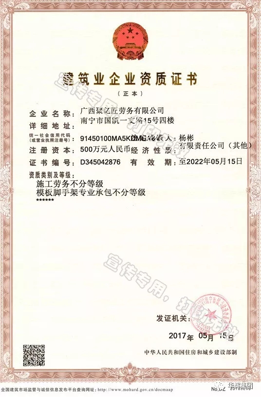 5月,3118云顶集团官网旗下广西聚亿匠劳务公司成功申报建筑业施工劳务资质。