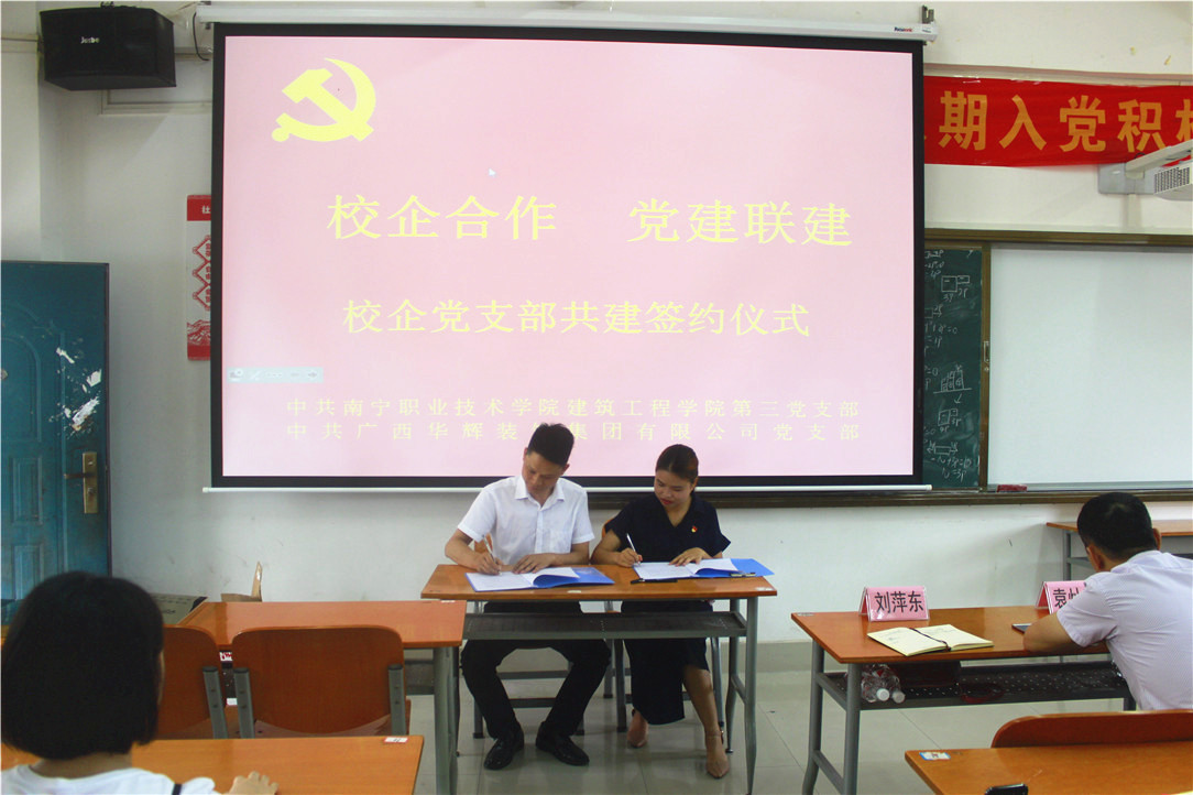 ▲签订校企党建联建协议:南宁职业技术学院建筑工程学院第三党支部书记钟海文(左)、3118云顶集团官网装饰集团党支部书记刘萍东(右)