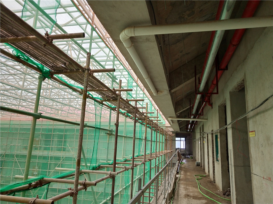▲焊工作业人员全部武装上阵认真焊接中庭延伸走廊钢结构工程