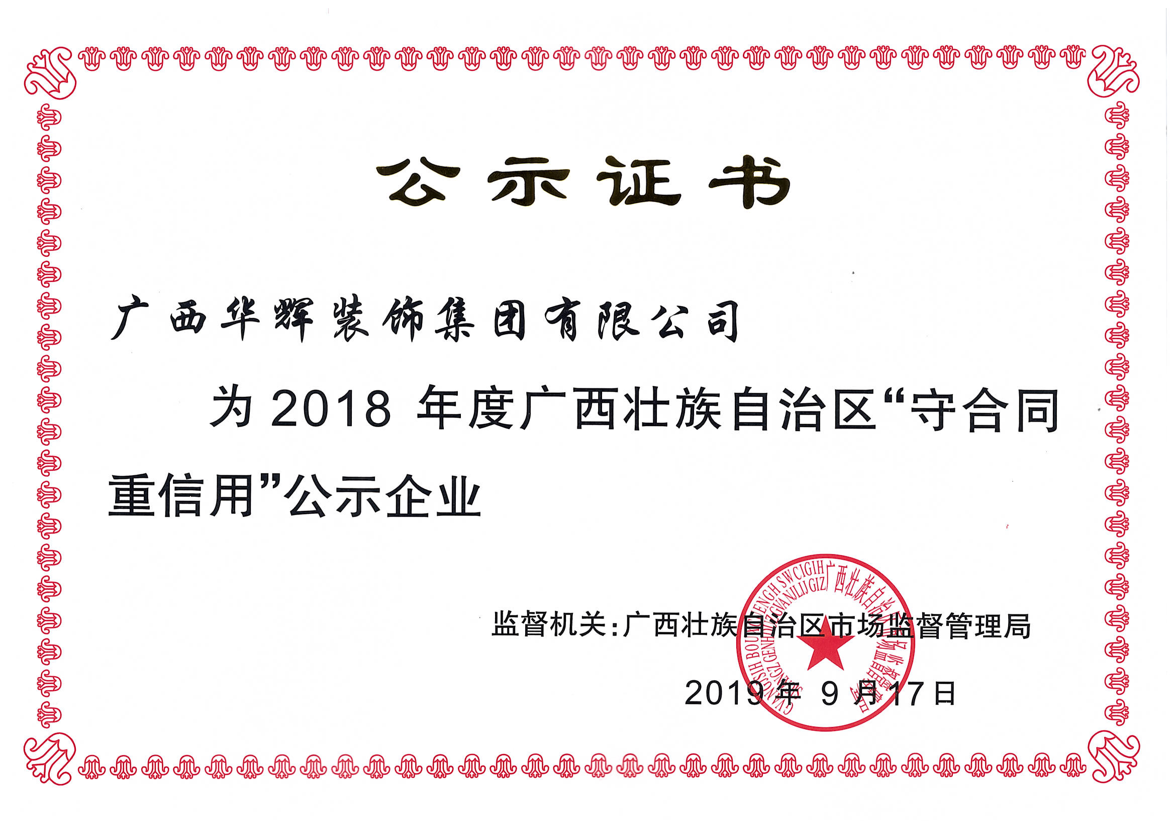 近日,在广西壮族自治区市场监督管理局开展的“守合同重信用”企业评选活动中,3118云顶集团官网凭借自身良好的信用体系建设、诚信守约形象,荣获2018年度广西壮族自治区“守合同重信用”企业。