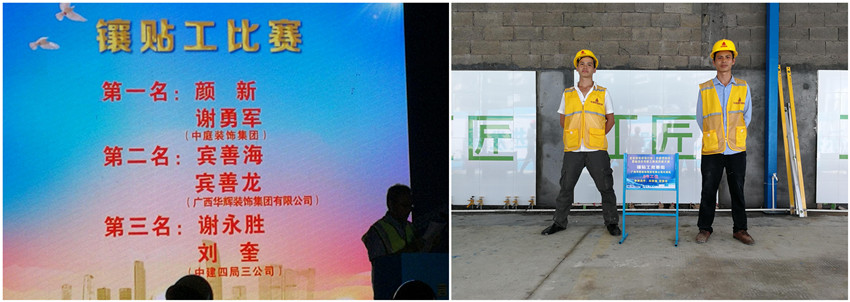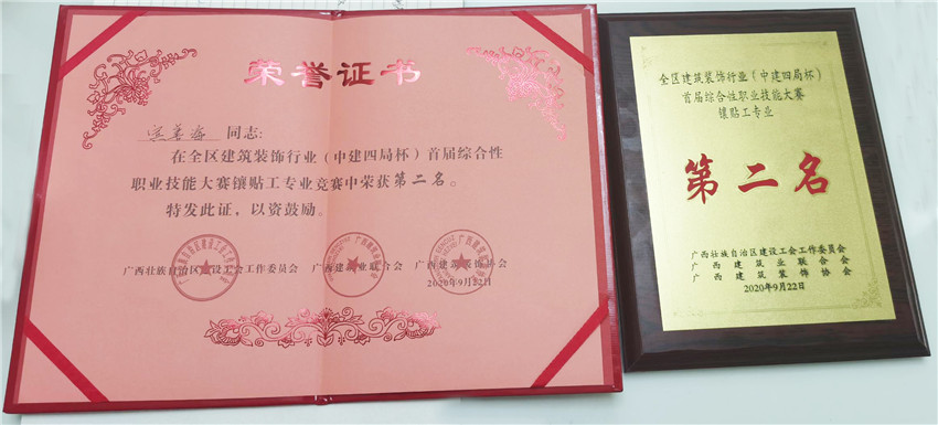 经过激烈的比赛角逐,3118云顶集团官网装饰集团代表队的两名选手宾善海、宾善龙,凭借着深厚的技术素养、稳定的赛场发挥,荣获镶贴工比赛亚军;代表队荣获团体奖第六名。