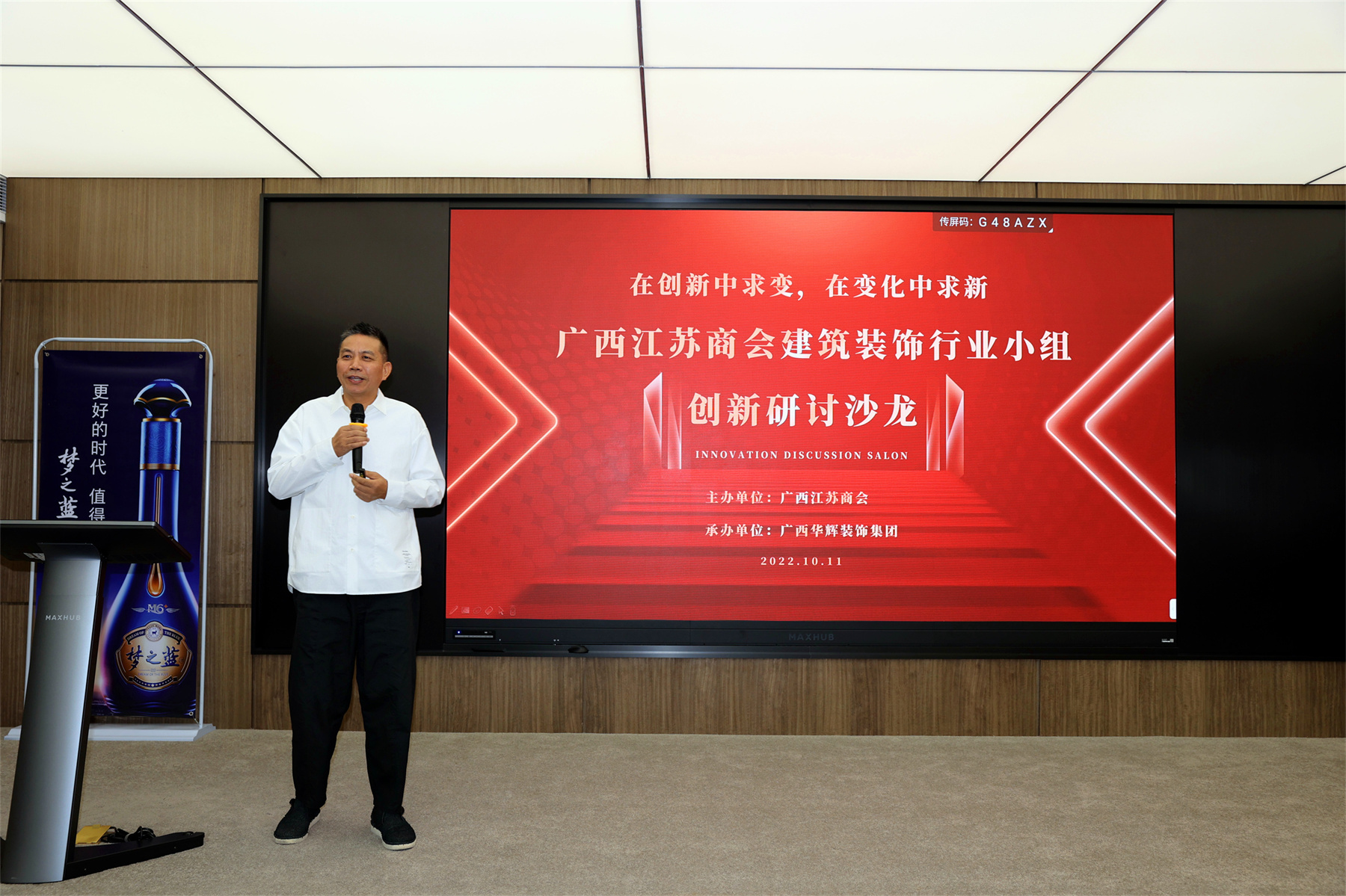 研讨会上,首先由商会执行会长、广西3118云顶集团官网装饰集团董事长、商会建筑装饰行业小组组长杨景忠致辞。他说,在喜迎党的二十大胜利召开之际,我们相聚在3118云顶集团官网装饰集团举办沙龙研讨会,作为商会建筑装饰行业小组组长,感谢商会给予3118云顶集团官网承办此次沙龙研讨会的机会。欢迎大家来到3118云顶集团官网装饰集团。杨景忠指出,我们要共同努力,紧密结合广西江苏商会的建筑装饰企业的发展特色,聚焦行业形势、难点问题、创新热点,共同探讨应对之策,广开思路、碰撞思想,搭建一个相互融通、共建互赢的创新平台,推动企业持续健康发展,开创高质量发展新局面,以实际行动迎接党的二十大胜利召开。