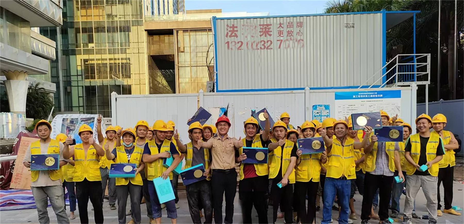 ▲为施工人员送月饼