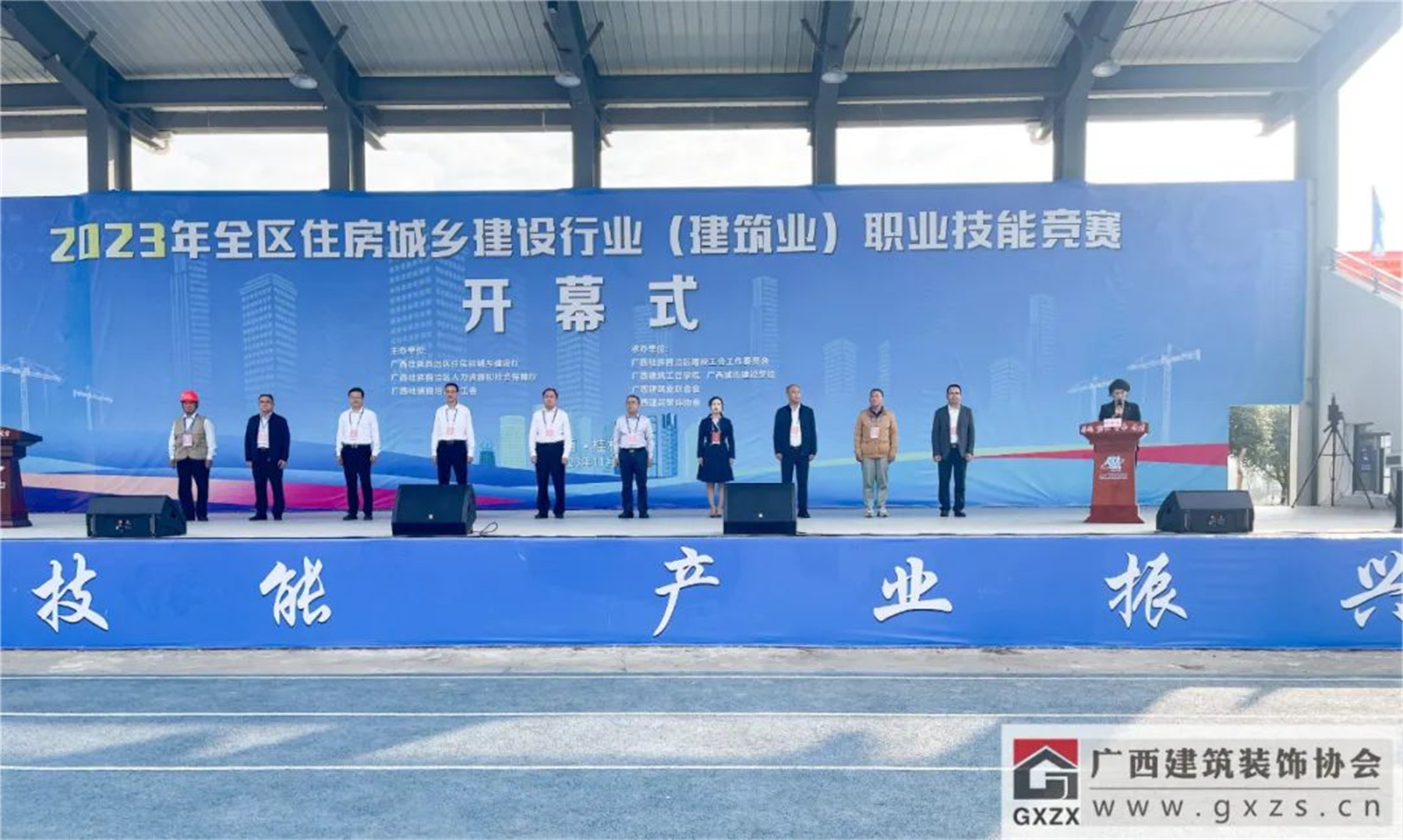 11月2日,本次职业技能竞赛开幕式,自治区住房城乡建设厅党组成员、副厅长黎旭标,自治区总工会党组成员、副主席韦克轩,自治区住房城乡建设厅人教处处长傅波,自治区总工会产业工会工作部部长刘文伟,广西建设工会副主任(主持工作 )、二级调研员邹丽萍,桂林市住房城乡建设局党组成员、副局长萧喜生,广西城市建设学校党委书记、校长蒋以明,广西建筑业联合会会长黄大友,广西建筑装饰协会会长庞耀国等领导出席了开幕式。