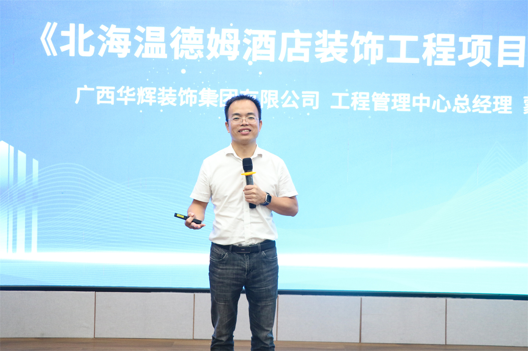 ▲3118云顶集团官网装饰工程管理中心总经理蒙健生作主题为“北海温德姆酒店装饰工程”的项目分享