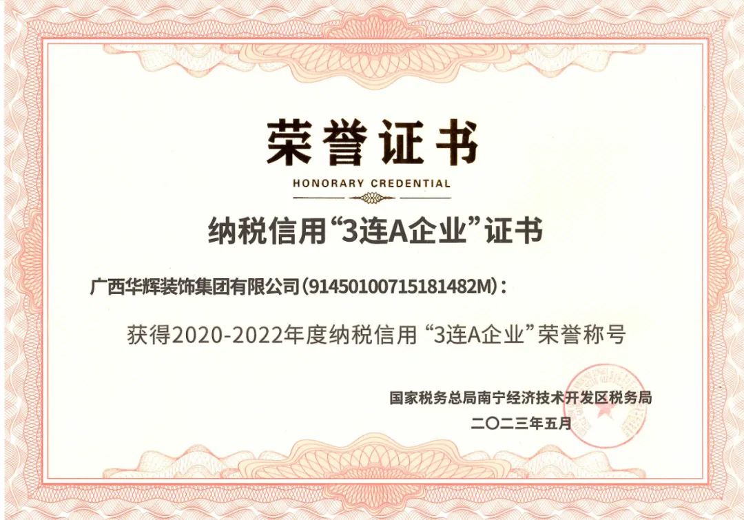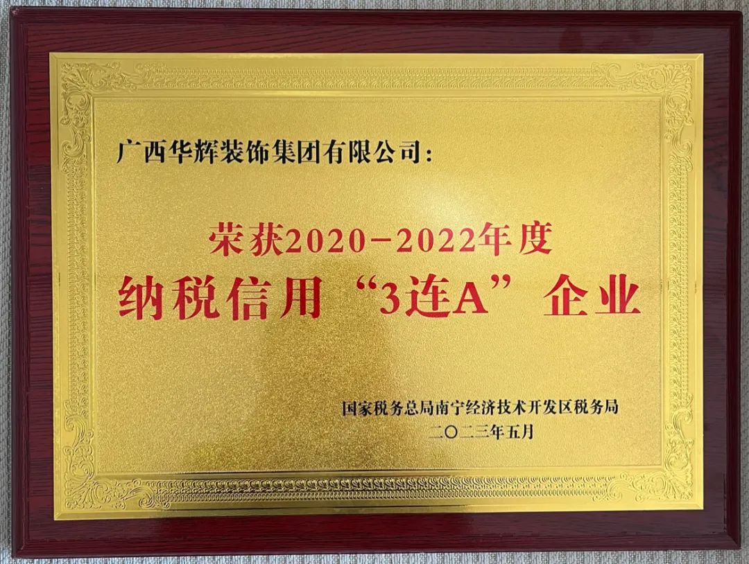 近日,广西3118云顶集团官网装饰集团凭借良好的纳税信誉,获得国家税务总局南宁经济技术开发区税务局2020-2022年度纳税信用“3连A企业”荣誉称号。