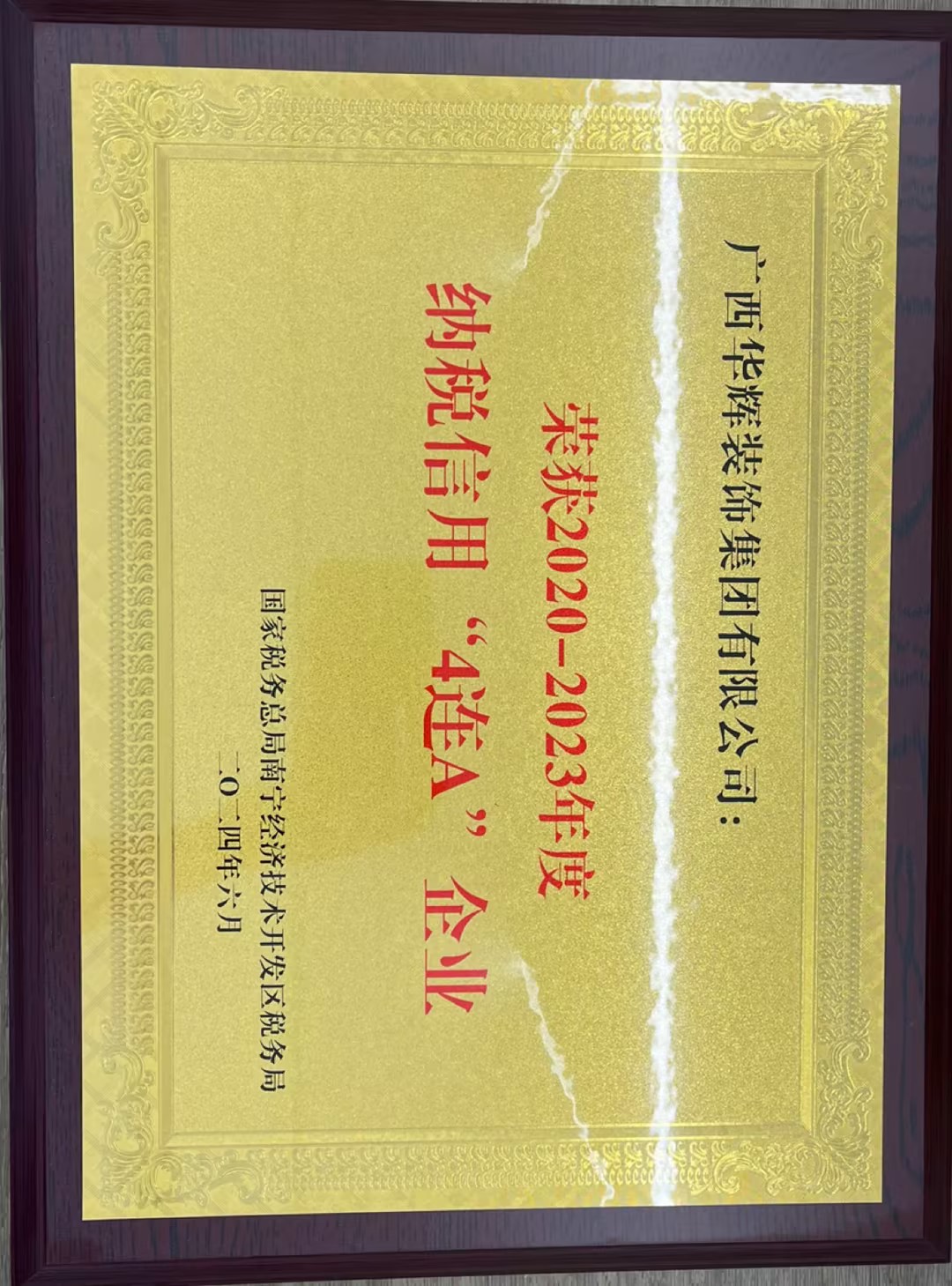 近日,广西3118云顶集团官网装饰集团凭借良好的纳税信誉,获得国家税务总局南宁经济技术开发区税务局2020-2023年度纳税信用“4连A企业”荣誉称号。