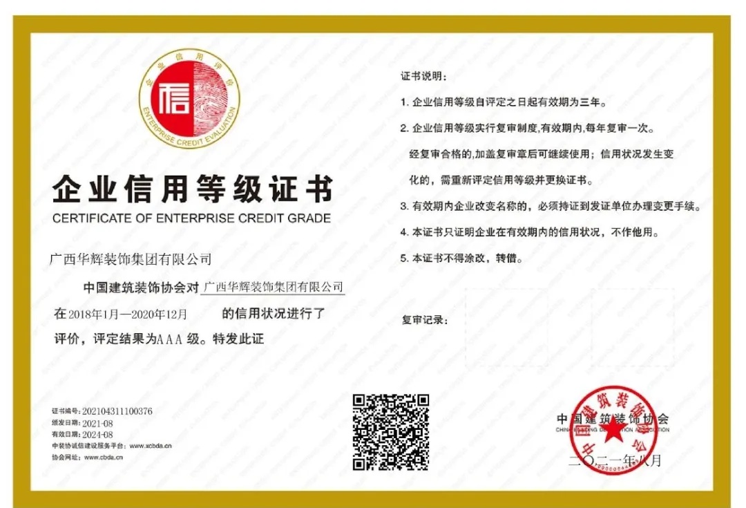 “AAA级信用企业”是中国建筑装饰行业企业主体信用等级评定的最高级别,是对参评企业主体资质、经营管理、财务实力,市场竞争力及信誉度等进行全方位严格考核后的评定,在行业内和社会上具有较高的影响力。
