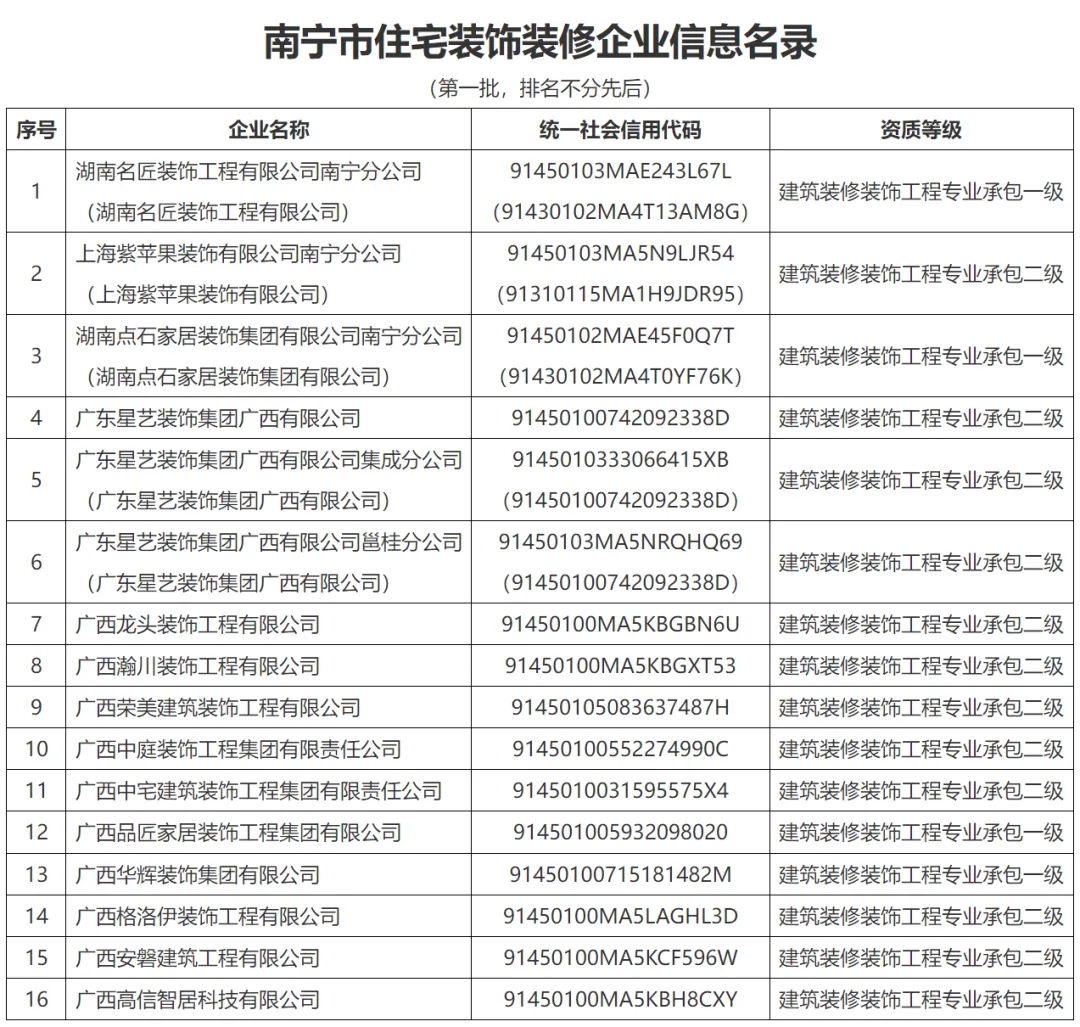 2024年11月4日,南宁市住房和城乡建设局公布了南宁市住宅装饰装修企业信息名录(第一批),3118云顶集团官网装饰集团成功入选。