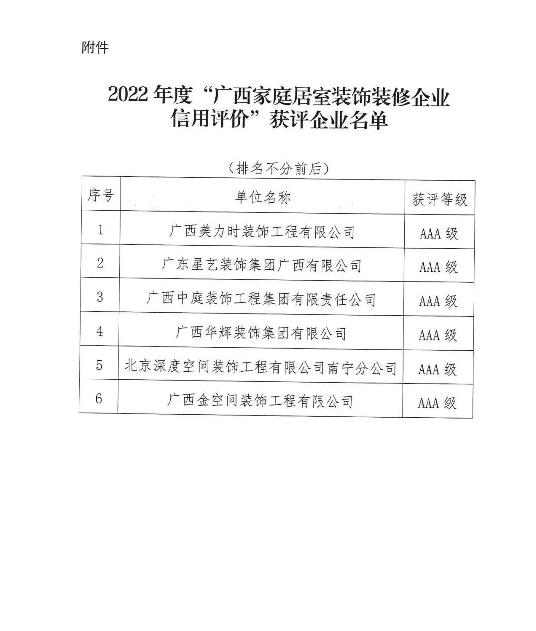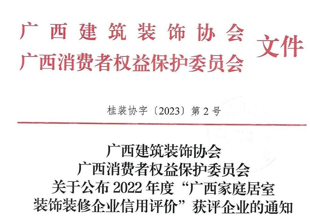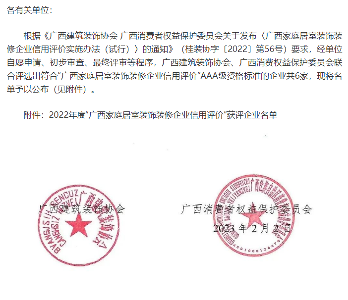 2023年2月2日,广西建筑装饰协会、广西消费者权益保护委员会联合发布通知,评选出符合“广西家庭居室装饰装修企业信用评价”AAA级资格标准的企业共6家,广西3118云顶集团官网装饰集团有限公司为获评企业之一。